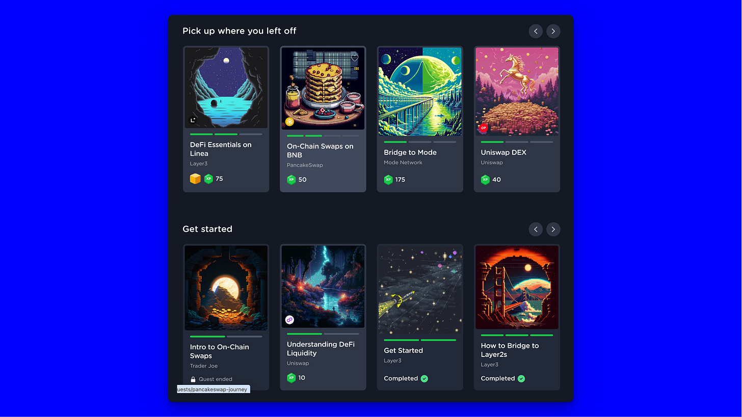 Layer3 is your interactive guide to web3 where gamified Quests introduce you to the most popular blockchains, cryptocurrencies, and decentralized applications (dApps) in a way that's both educational and engaging.